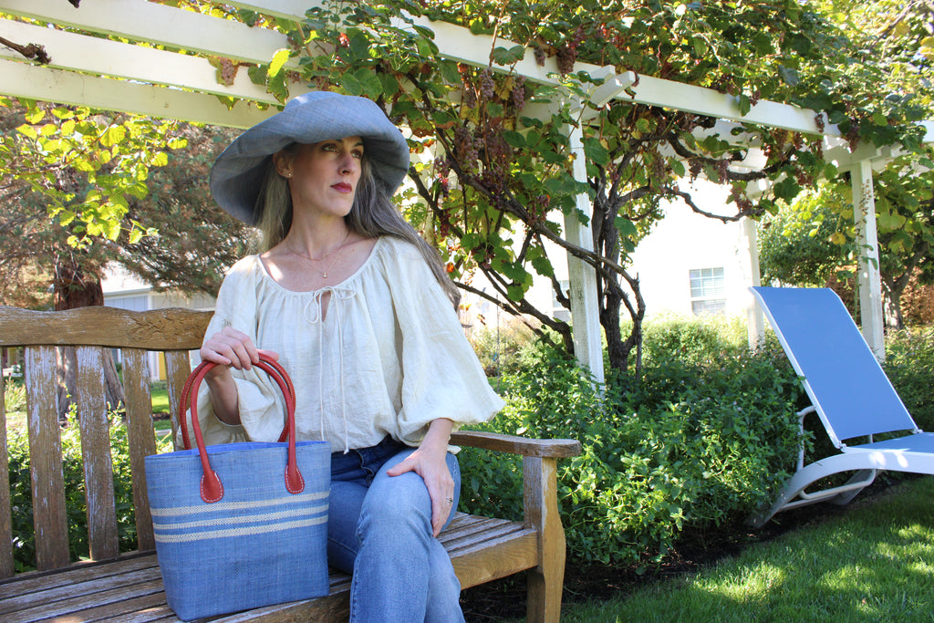 Our designer works closley with our 400 plus family of artisans to create beautiful, unique, and functional pieces. Natural raffia fibers are hand dyed, then hand loomed, braided, or crochet into sublime textures and patterns. Many pieces are lined with small batch hand printed African fabrics that vary from item to item. We are so proud to work with & support the people behind these products.