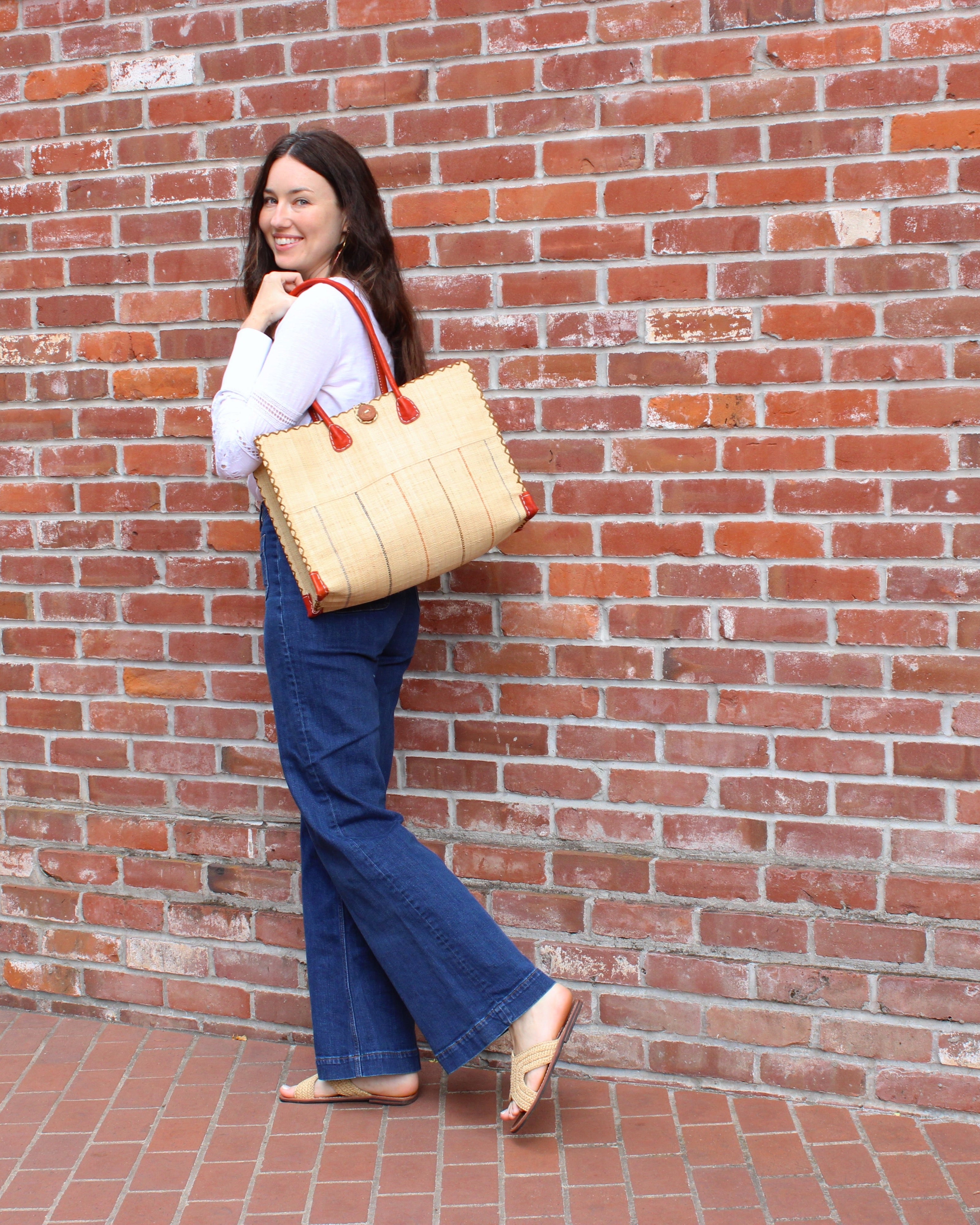 Contents: raffia palm fiber, leather handles, unlined small or plastic liner medium & large, button closure.